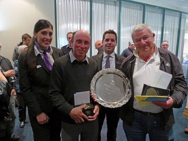 L-R Alessandra Paduos (Quest Sponsor), David Beauchamp (Winner Senior Pairs), Daniel Wilkinson (Quest Sponsor) and Mike Hughes (Winner Senior Pairs) holding the Ian McCance Trophy
