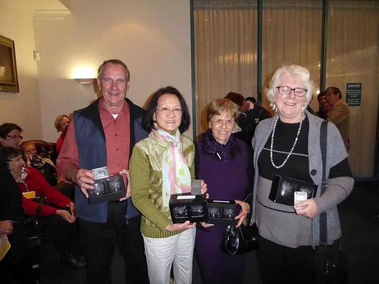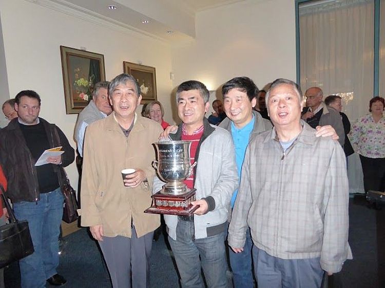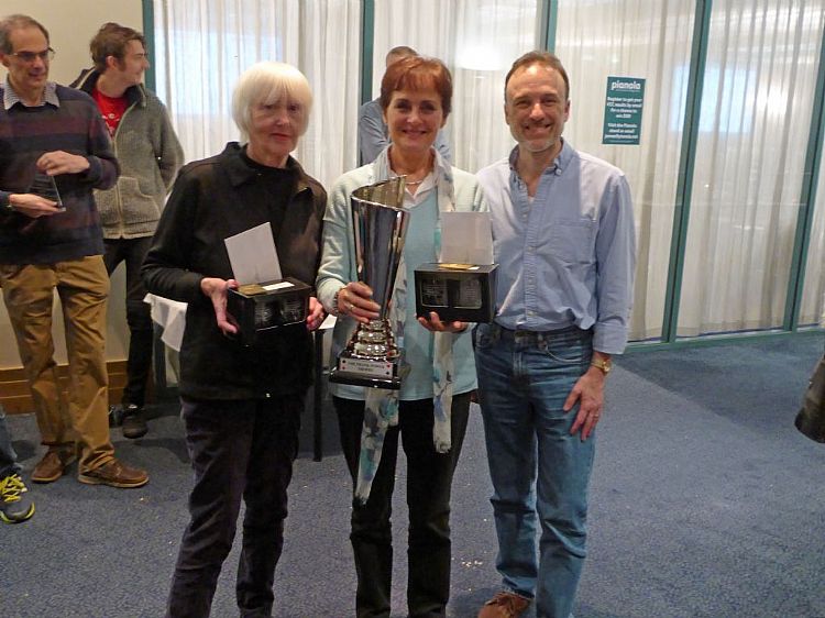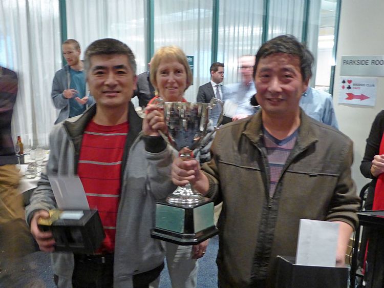Ming Zhang & Yao Lu (Winners Victor Muntz Restricted Pairs) with Kitty Muntz who presented the Victor Muntz Cup)