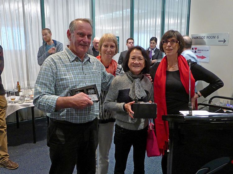 Ming Zhang & Yao Lu (Winners Victor Muntz Restricted Pairs) with Kitty Muntz who presented the Victor Muntz Cup)