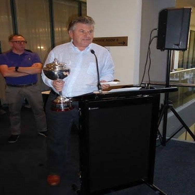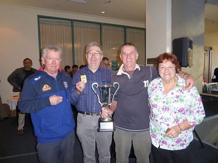 L-R Alessandra Paduos (Quest Sponsor), David Beauchamp (Winner Senior Pairs), Daniel Wilkinson (Quest Sponsor) and Mike Hughes (Winner Senior Pairs) holding the Ian McCance Trophy